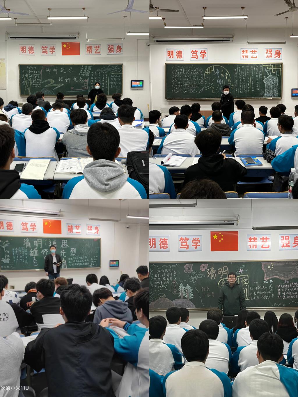 班会上,班主任向同学们讲解了清明节的来源及其文化内涵,号召大家既要尊重传统文化,传承节日礼俗,又要科学地革除陋习。在中华民族争取民族独立和繁荣发展的过程中,涌现了许多爱国志士,用自己宝贵生命换来了我们现在和平幸福的生活,号召同学们要有感恩之心,继承弘扬先烈们为人民无私奉献的精神。接着,同学们通过演讲、诗朗诵等方式表达了对先烈们的崇敬之情,纷纷表示要铭记历史,缅怀先烈,从他们的身上汲取奋勇前行的力量,为祖国贡献出自己的一份力量。