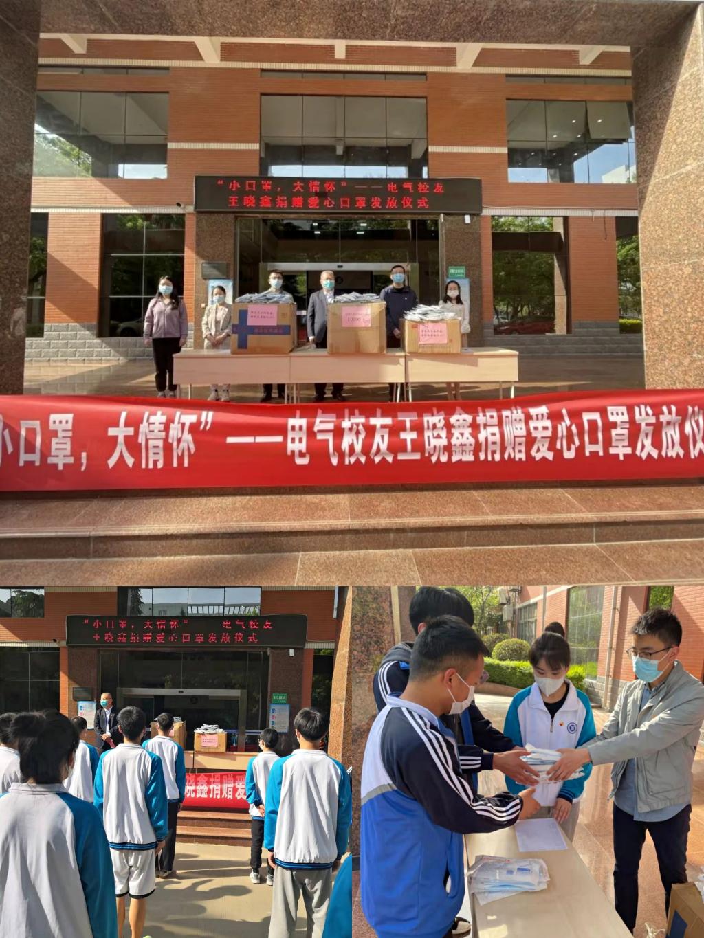 4月7日下午,自动化技术5132班校友王晓鑫同学向电气学院捐赠一次性医药外科口罩10000只,N95口罩50个,助力学院疫情防控工作。电气学院在行知楼A前对20级、21级学生进行爱心口罩发放仪式,党总支书记韩伟、学工办全体辅导员、部分学生代表参加。