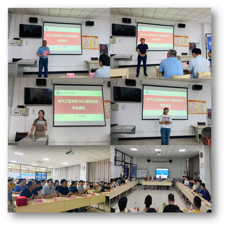 首先,夏东盛院长对电气工程学院615名2021届毕业生完成学业、顺利毕业表示祝贺,并对他们即将走上工作岗位,为国家做出贡献寄予了厚望,也欢迎同学们在工作之余常回母校看看。随后,自动化技术1801班王英英同学代表全体毕业生对三年来辛勤付出的全体老师表示衷心感谢,并表示将继续努力,为母校争光;电子1801班班主任辛慧娟作为班主任代表发言,为同学们送上真挚祝福和美好祝愿,学工办主任赵松给毕业生强调了离校手续办理流程及离校期间纪律、安全等注意事项。