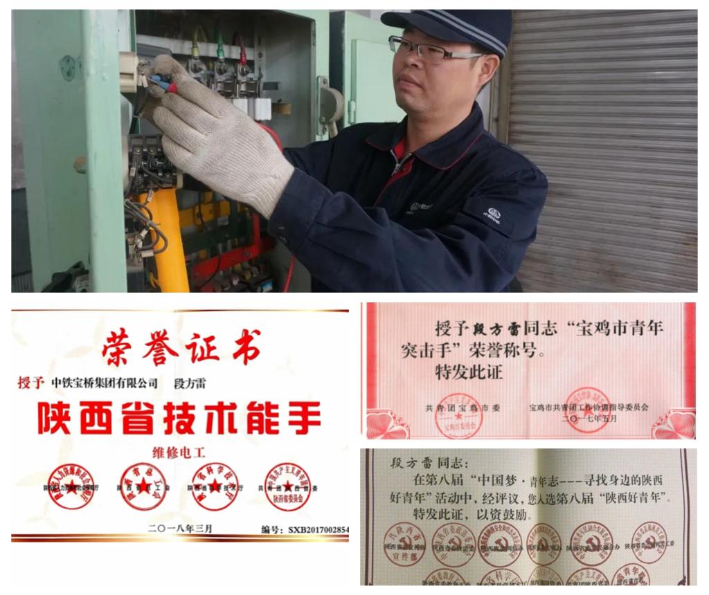 段方雷,男,1986年生,中共党员,系我院工业自动化技术2004级工电0401班毕业生,目前就职于中铁宝桥集团有限公司,在公司动力车间从事电气维修和安装工作现兼任团支部书记。工作期间,段方雷同志恪尽职守,兢兢业业,就职公司13年,始终坚守在工作一线,在平时工作中不但注重理论知识的学习,更加注重实际操作能力提升。先后获得公司第二届“金牌职工”称号,集团公司“先进生产者”称号,“中国中铁优秀团干部”称号,“中国中铁青年岗位能手”称号,宝鸡市青年突出手、陕西省职业技能大赛维修电工个人第四名与团体第六名,陕西省技术能手等十余项集团公司、省市级称号。