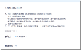 按照教师布置的学习任务的安排,学生在上课前在智慧树平台观看共享课程《电工线路规划与实施》教学视频做好课前预习工作;在课表上课时间段在班级QQ群(分享屏幕)上直播课,并参与互动,每次上课前五分钟在知道app签到考勤;认真学习,积极参与教学环节,按时完成教师布置的学习任务。