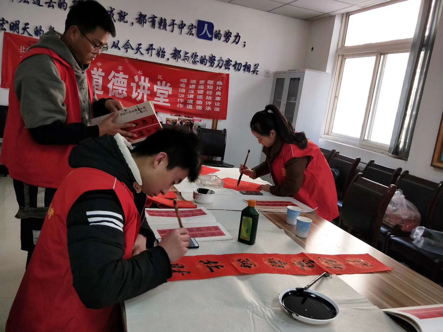 在紧张有序的维修活动进行的同时,我院书画社的几名学生正忙碌地为当地居民写“福”字、写春联,学生们精湛的书法功底得到了社区领导和当地居民的一致称赞。最后将写好的“福”字和春联一并分发给社区居民,为这寒冷的冬日增添了几分年味、几分喜气。