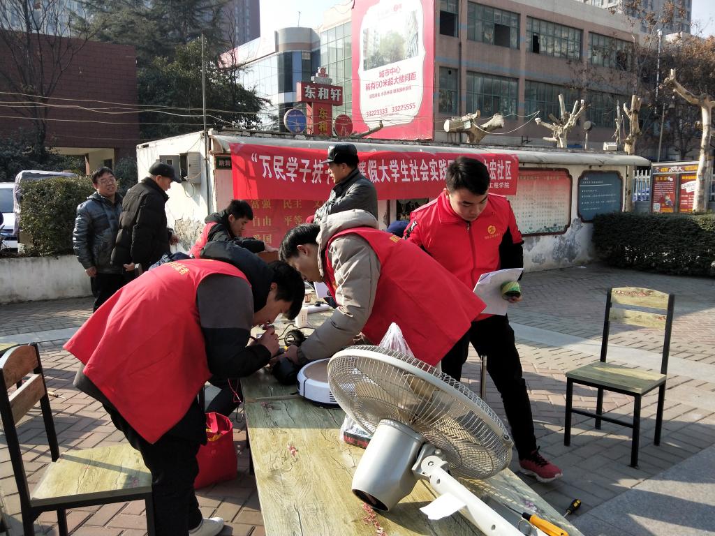 为落实《中共陕西省委教育工委关于组织开展“万名学子扶千村”2019年寒假社会实践扶贫攻坚专项活动的通知》(陕教工团〔2019〕1号)文件精神,提高大学生服务他人、服务社会的责任意识,1月17日,电气工程学院电气维修协会与我院书画社共计14名学生在学工办辅导员的带领下前往咸阳市中宏社区进行义务维修家电、送春联活动。