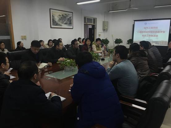 为落实学院《关于开展“三秦教师结对帮扶贫困学生”专项行动实施方案的通知》陕工院党字【2017】105号文件精神,进一步落实习近平总书记“扶贫先扶志,扶贫必扶智”的指示精神,2017年12月26日下午电气工程学院在行知楼A五楼教学办召开“三秦教师结对帮扶贫困学生”专项工作推进会,学院党委委员、纪委书记康强、电气工程学院党政领导及全体教师参加了推进会,会议由党总支书记杜云主持。