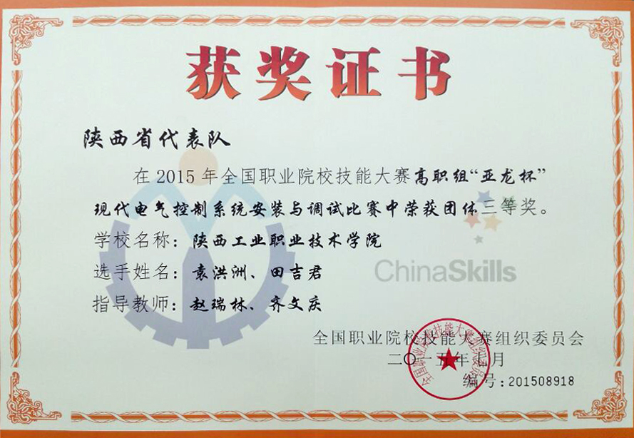 7月1至4日,全国职业院校技能大赛高职组制造大类“现代电气控制系统安装与调试”赛项比赛在天津举行。由我院电气工程学院教师赵瑞林、齐文庆指导的自动化1207班袁洪洲、自动化1302班田吉君两位学生组成的陕西代表队荣获团体三等奖,两位选手良好的专业水平和职业素养得到现场专家裁判的好评。
