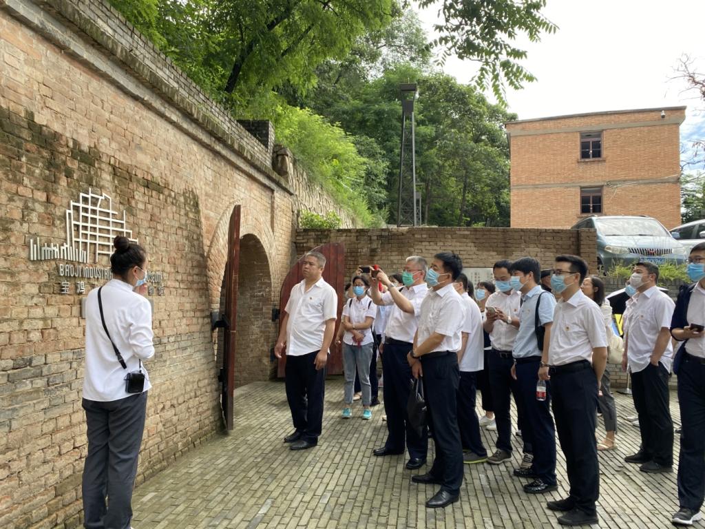 在长乐塬抗战工业遗址,党员们走进申新纱厂的窑洞工厂和薄壳厂房,伴随着讲解员的生动讲述,在一幅幅沧桑的历史照片、7纵6横交错的窑洞车间、80多年保存完好的青红砖箍制窑洞、年久的纺织机器与宝钛设备、石油机械井架、航空无人机等“宝鸡制造”现代化工业产品频频驻足。党员们被民族企业家及产业工人的实业救国情怀和革命先烈的英雄事迹、抗战英雄的革命精神而感召,为厚重的老工业积淀而感叹。随后,在长乐塬抗战工业遗址正门前,全体教师党员重温入党誓词,怀着敬仰之情,用洪亮的声音向党旗做出最为庄严的承诺。