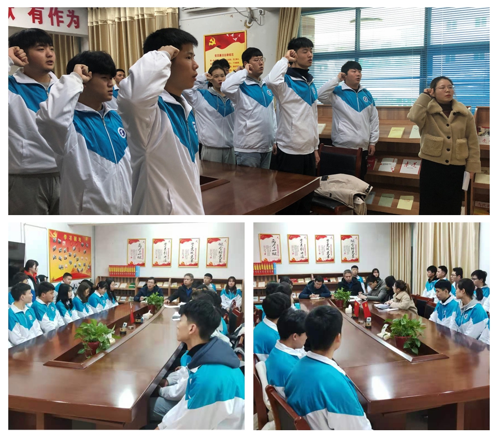 会议首先奏放了国际歌,然后由陈春山老师代表党委宣读中共陕西工业职业技术学院学生工作委员会《关于接收预备党员的审批意见》,第二支部书记赵松老师给预备党员提了几点要求,紧接着由李小燕老师带领预备党员们面向党旗进行庄严宣誓。