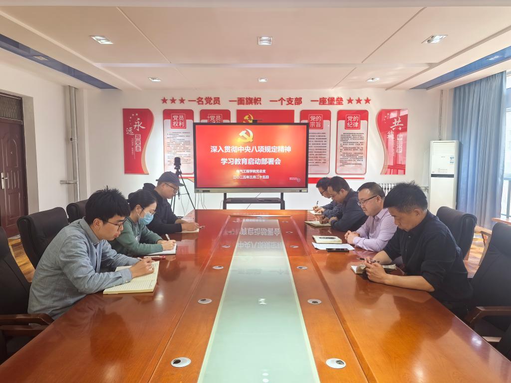 3月25日下午,电气工程学院在行知楼A506会议室召开深入贯彻中央八项规定精神学习教育启动部署会,党总支班子成员及各支部书记参加会议,会议由党总支书记刘其兵主持。