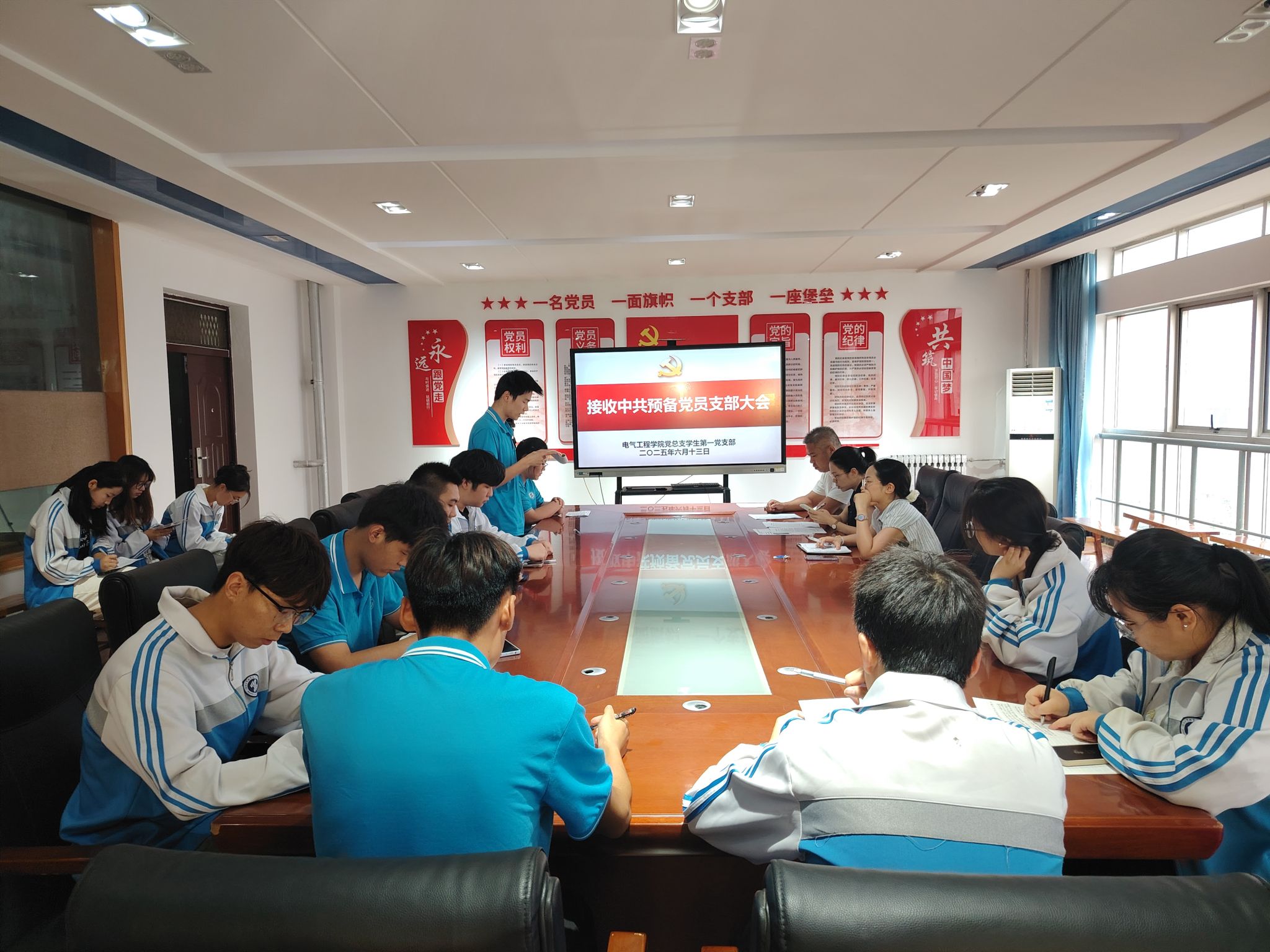 为进一步加强党员队伍建设,7月1日下午,电气工程学院学生第一党支部在行知楼A506党员活动室组织召开接收预备党员支部大会,研究接收刘浩、王淑婷等13位同志为中共预备党员,支部全体党员参会,会议由支部书记李小燕同志主持。