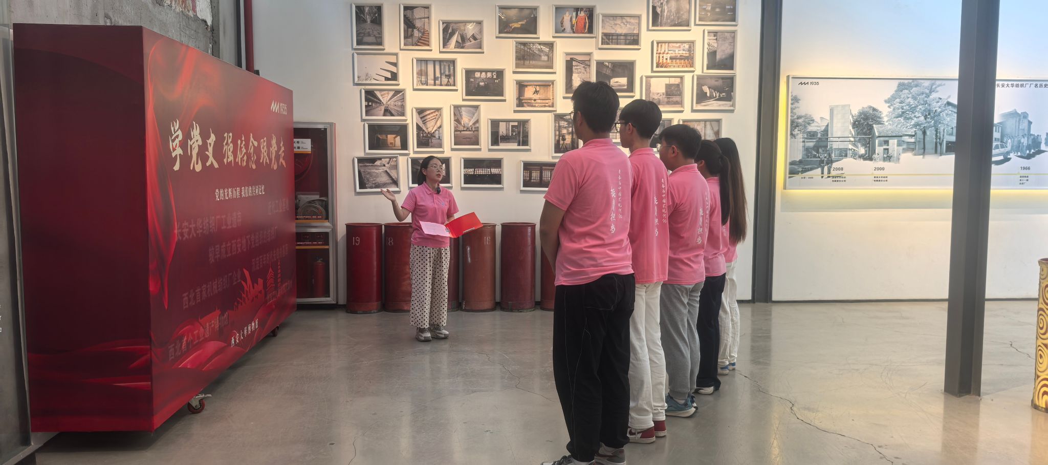 在讲解员的引导下,实践团成员循着时间线索,深入了解了大华1935的前世今生。其前身为1935年建成的大华纺织厂,作为民国时期西北地区重要的纺织工业基地,初创时便承载着“实业救国”的理想。讲解员介绍,建厂初期,面对设备短缺、技术落后的困境,老一辈创业者凭借坚韧意志,逐步奠定了西北纺织工业的基础;抗战时期,工厂克服轰炸威胁坚持生产,为前线提供军需物资,成为支援抗战的工业力量;新中国成立后,通过公私合营迈入快速发展阶段,生产规模与技术水平显著提升,一度成为区域纺织业的标杆,产品远销各地,见证了计划经济时期工业体系的建立与壮大。
