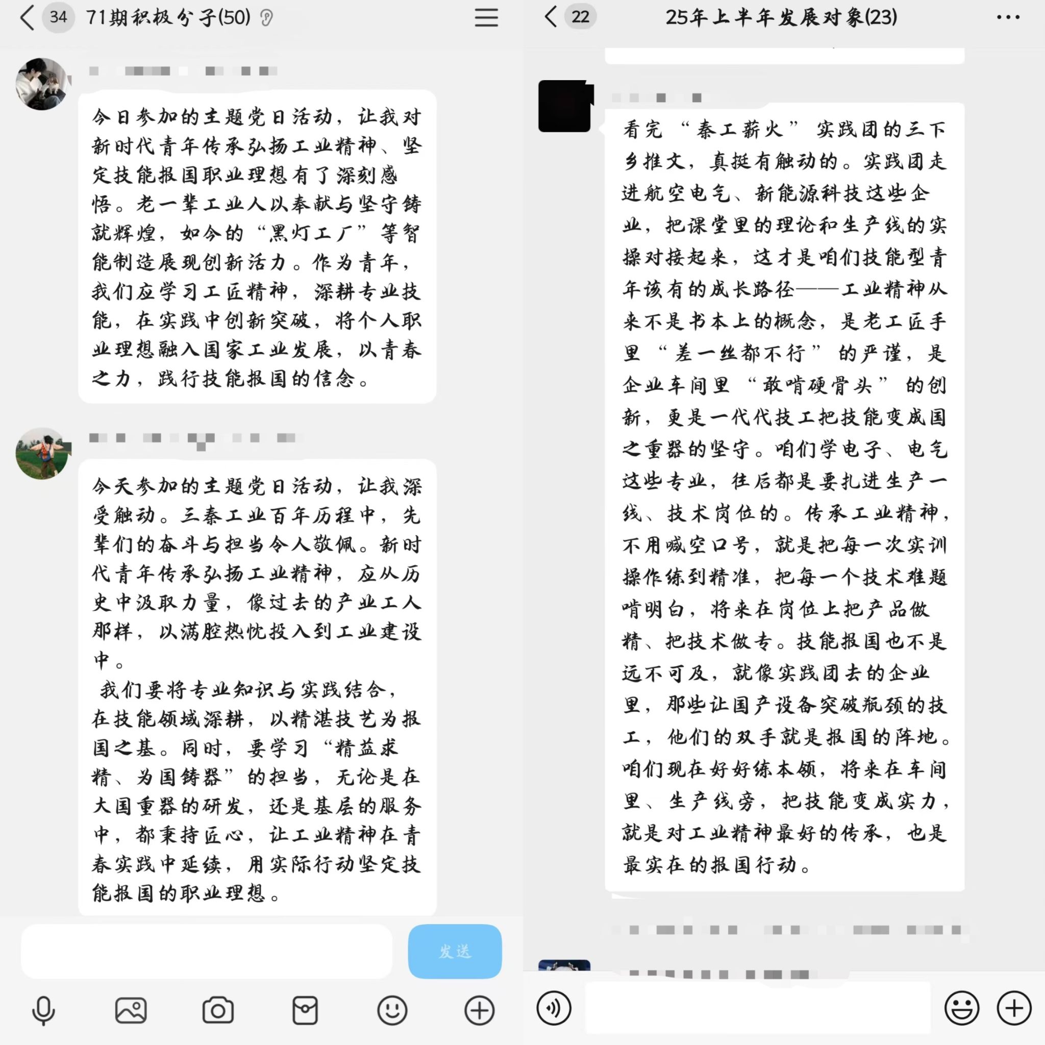 学习活动采取线上与线下相结合的方式,线上由入党积极分子、发展对象分享个人学习感悟,物联网2401班赵展飞同学分享:我们应当从老一辈产业工人的奋斗精神中汲取力量,将个人所学与国家需要紧密结合,以实际行动践行“技能报国”的职业理想,努力成为新时代高素质技术技能人才。线下由在校同学在各自寝室自主学习实践活动内容,以寝室为单位结合电气专业特点各抒己见:有的同学表示,老工业人在艰苦条件下攻克技术难关的事迹,让自己更加坚定了学好电气技术、提升专业能力的决心;有的同学提出,要将红色工业精神融入日常实训操作,培养精益求精的职业习惯;还有同学分享了自己未来参与工业领域实践、助力技术创新的职业规划。