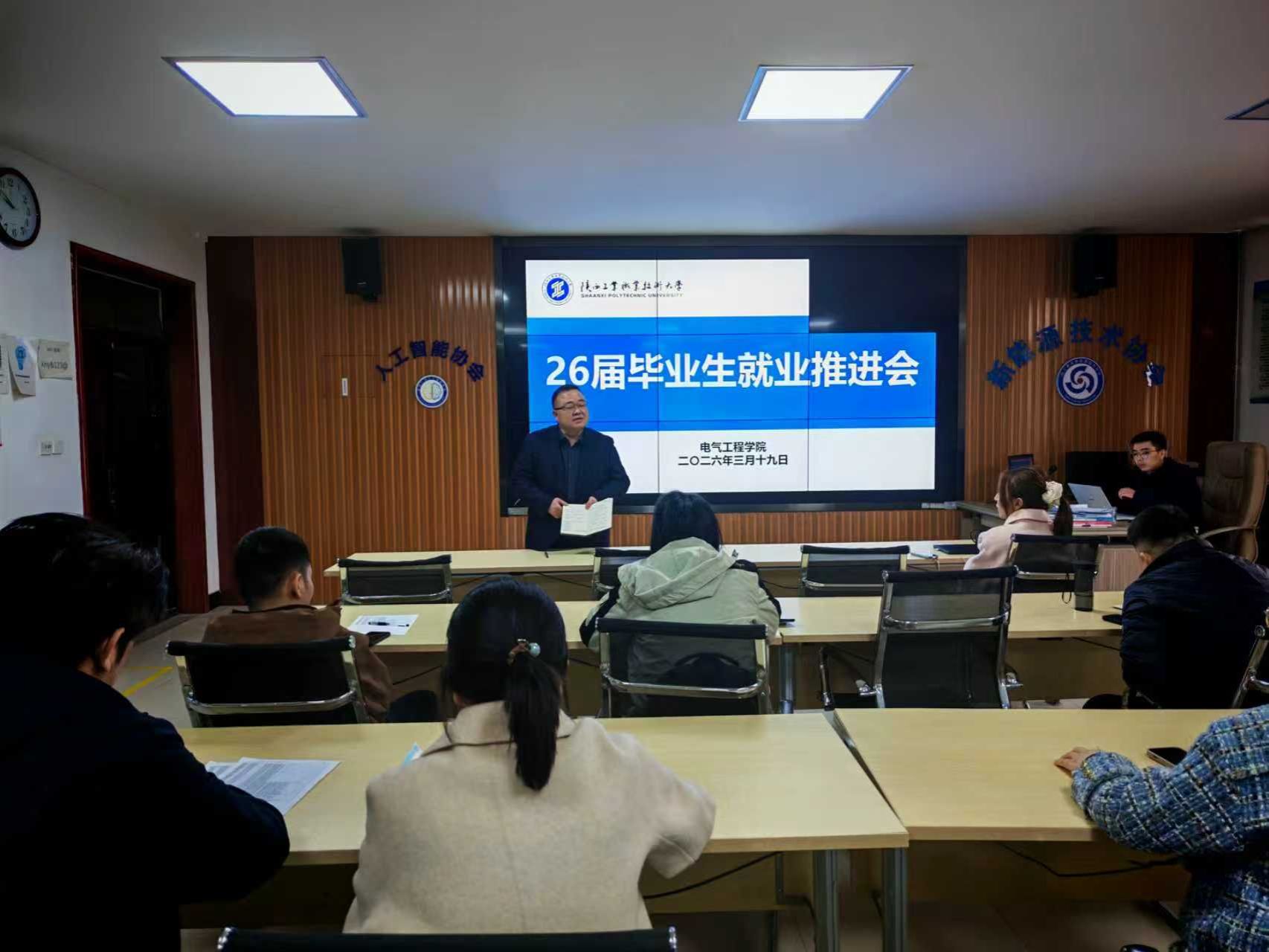 3月19日,电气工程学院在行知楼A506召开2026届毕业生就业工作专项推进会,学院党总支书记刘其兵、全体辅导员及2023级毕业班班主任参会,会议由学工办主任陈春山主持。